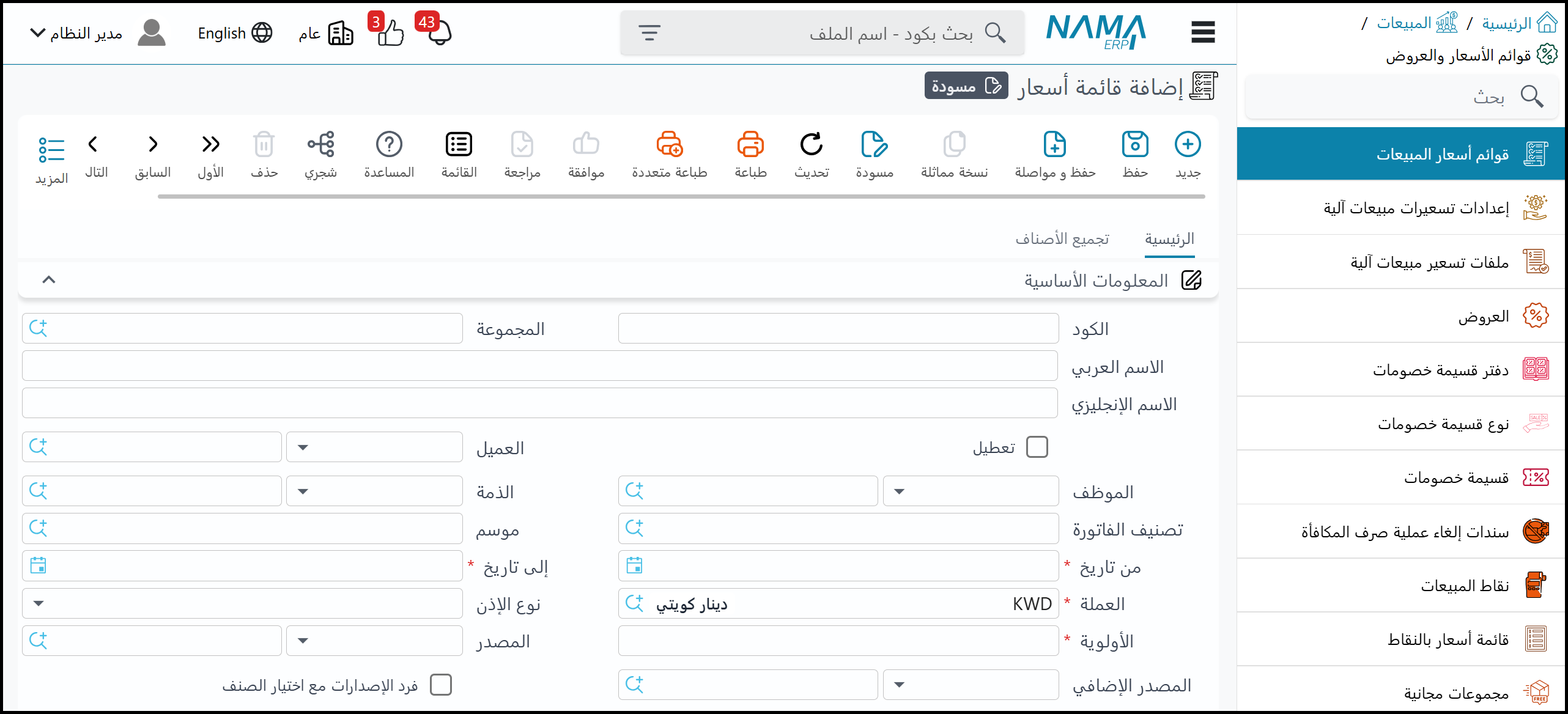 - العميل: يمكن تخصيص قائمة الأسعار لعميل معين.