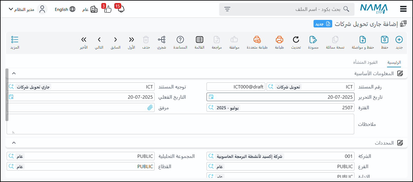 توسع المفهوم: العملية ليست مقتصرة على الأموال فقط؛ فكرة "جاري تحويل الشركات" تمتد لتشمل نقل الأصول (باستخدام سند نقل أصل) وتحويل المخزون (باستخدام سند التحويل المخزني) بين الشركات، بنفس المفهوم المحاسبي.