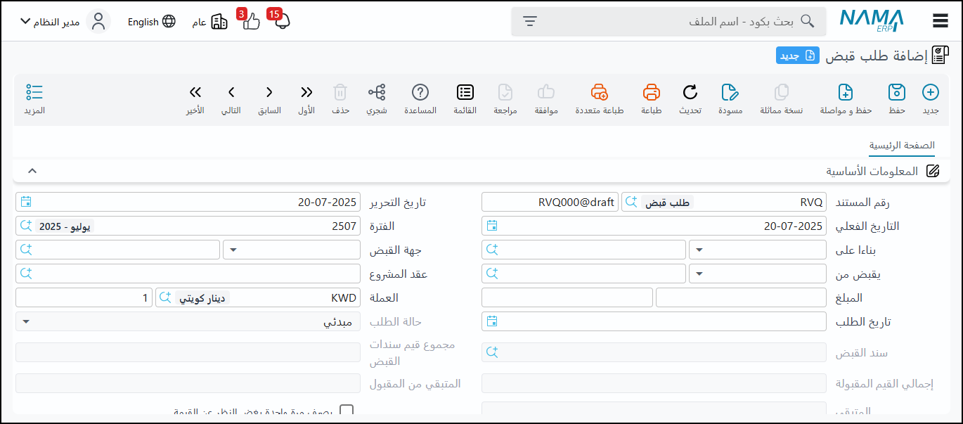 الغرض: يستخدم لتسجيل طلبات استلام المبالغ المالية من قبل الأشخاص الذين ليس لديهم صلاحيات محاسبية مباشرة.