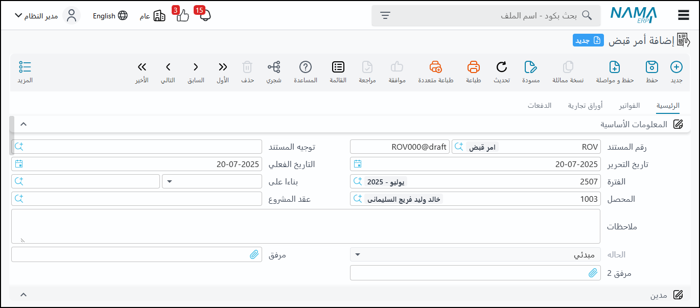 الوصف: هو مستند شبيه بسند القبض ولكنه بدون تأثير فعلي على الحسابات، يُستخدم لتهيئة البيانات أو كأمر تنفيذي.