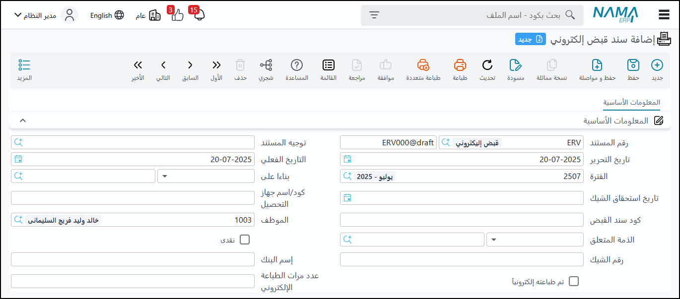 - تصل هذه البيانات إلى النظام، حيث يمكن للمحاسب تحويل سند القبض الإلكتروني إلى سند قبض عادي لإنشاء القيد المحاسبي