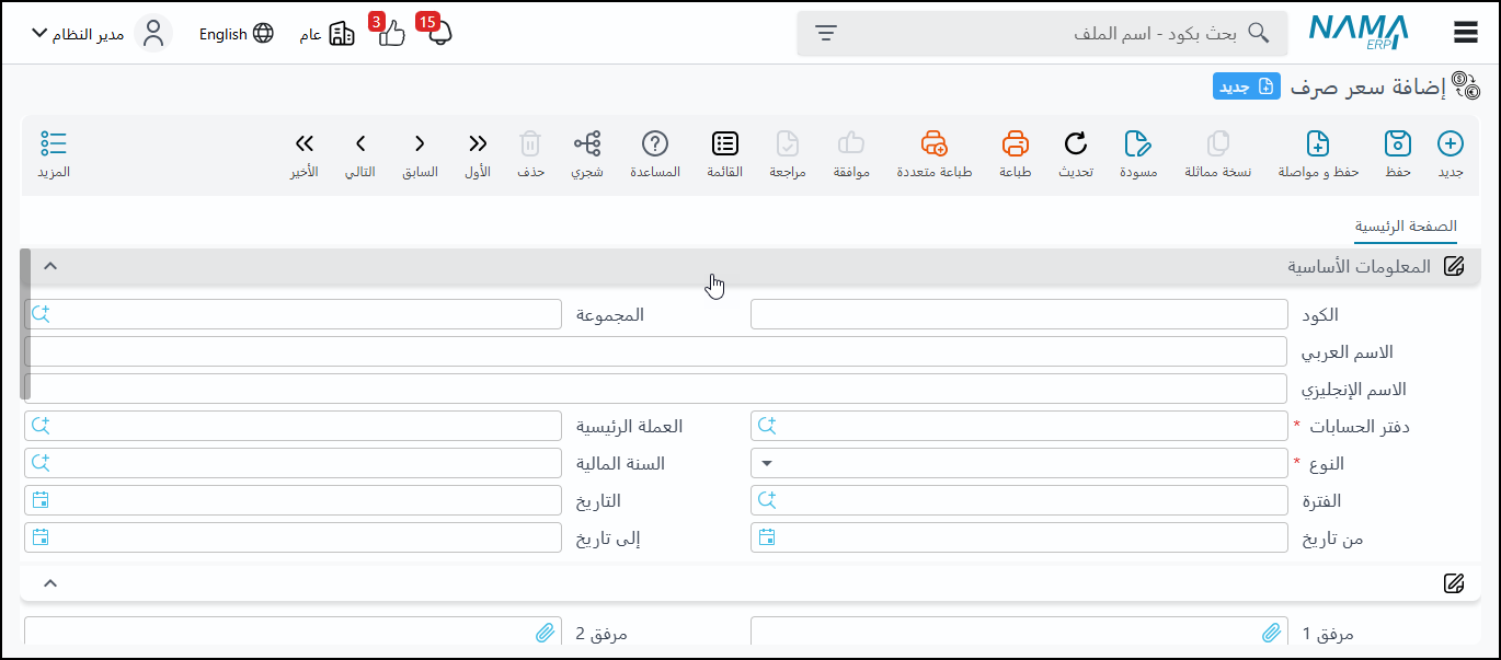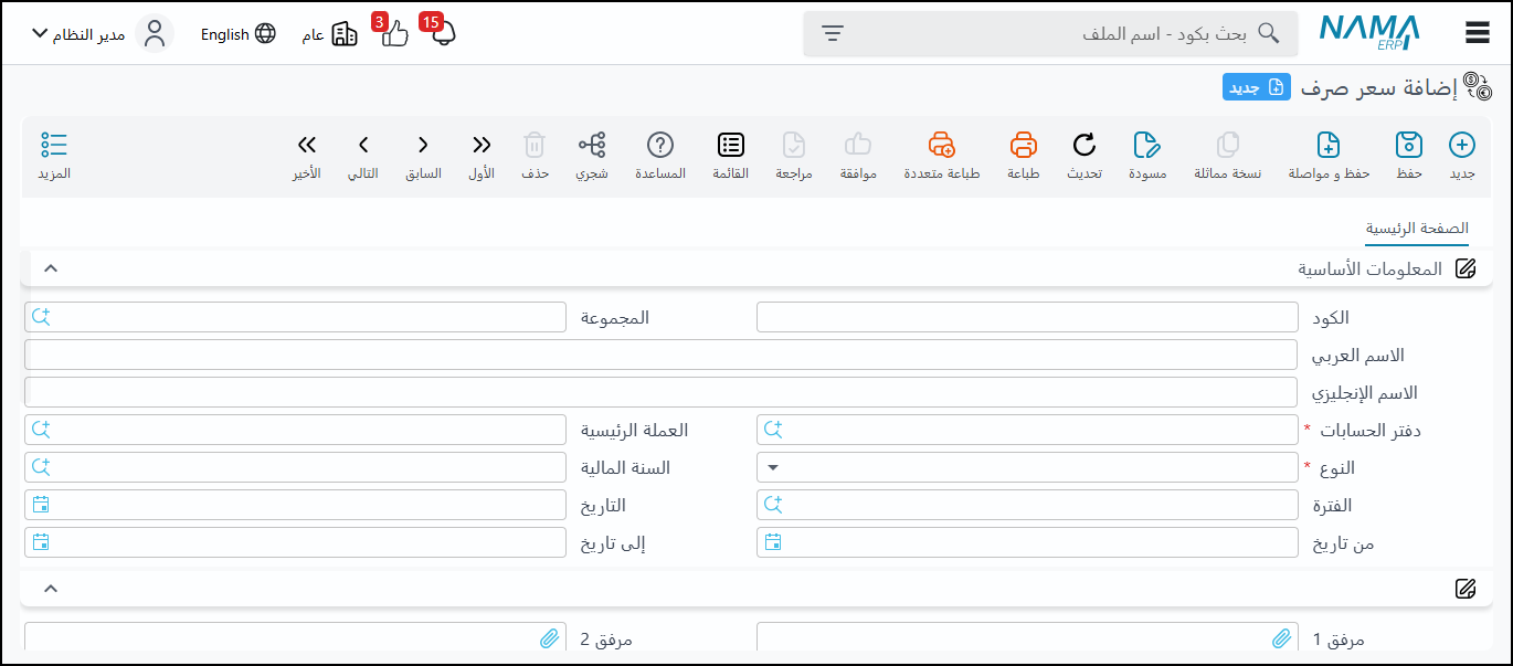 الغرض: لتسجيل وتحديث أسعار الصرف للعملات المختلفة في النظام، ويمكن تسجيل سعر الشراء وسعر البيع للعملات.