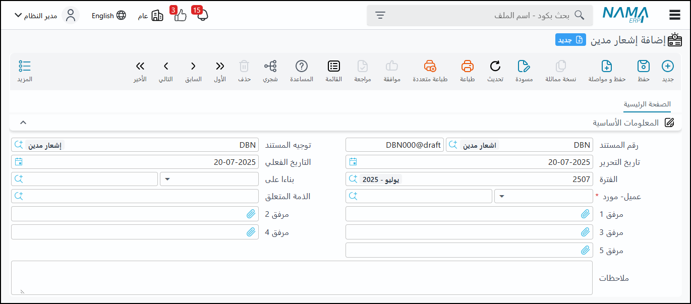 إشعار المدين: يُعد إشعار المدين بديلاً لسند القبض أو سند الصرف، ويمكن التحكم في كيفية معالجته (سواء كقبض أو صرف) في تأثيره على المبلغ المتبقي عبر خاصية "التوجيه" في النظام، ويؤثر إشعار المدين في فاتورة المبيعات إذا تم إنشاؤه بناءً عليها