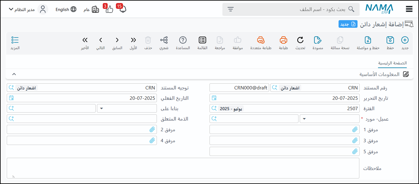 يحتوي على نفس وظائف اشعار المدين فيما يتعلق بضريبة الخصم والتعامل مع فواتير متعددة.