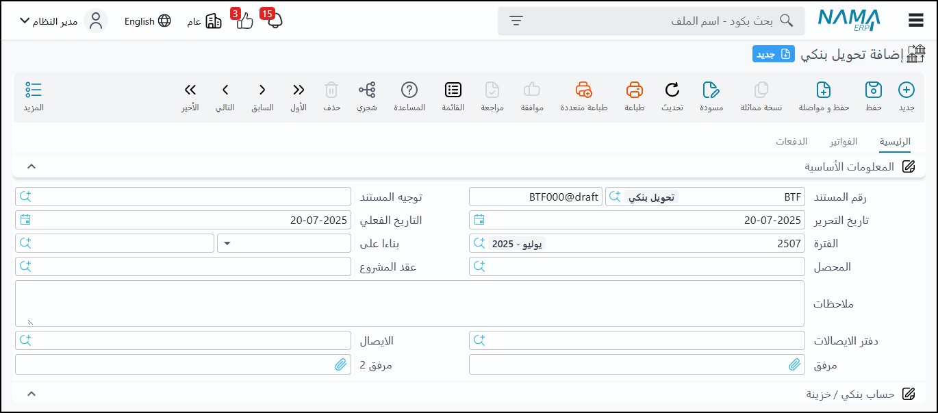 الغرض: لتسجيل التحويلات البنكية، سواء كانت تحصيل أم دفع، ويتشابه بشكل كبير مع سند القبض والصرف.