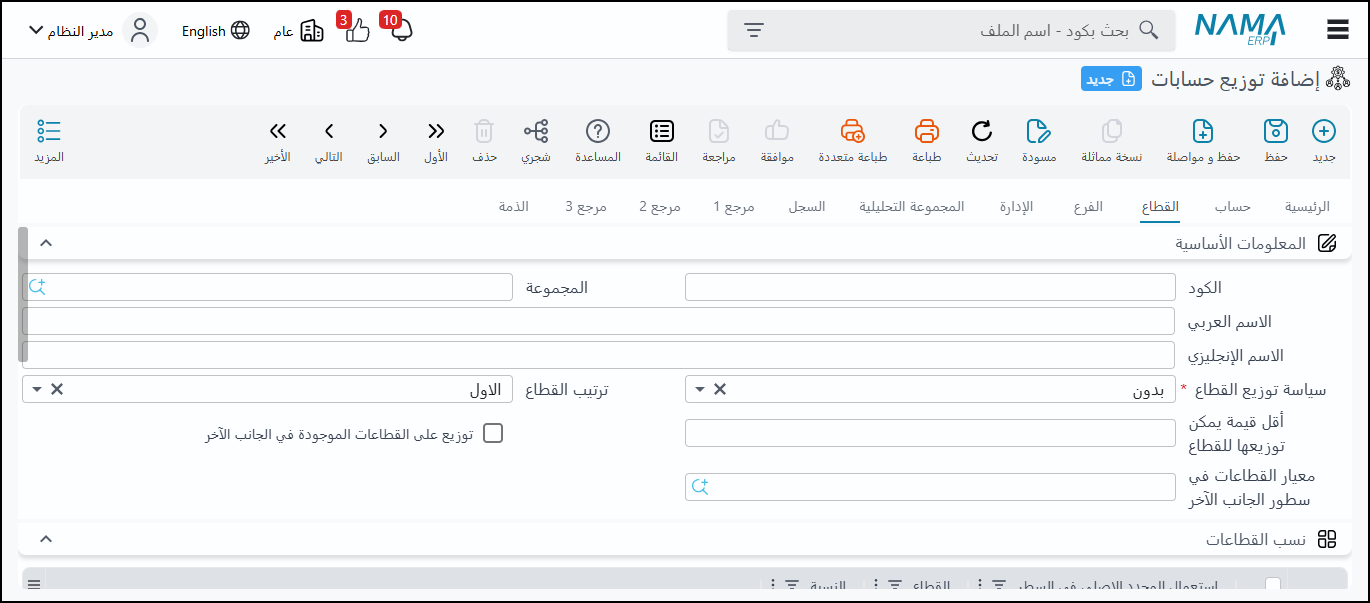 يتيح النظام توزيع أرصدة الحسابات (مصروفات، إيرادات، إلخ) على المحددات الأربعة الأخرى (فروع، قطاعات، إدارات، مجموعات تحليلية). يمكن التوزيع بناءً على:
