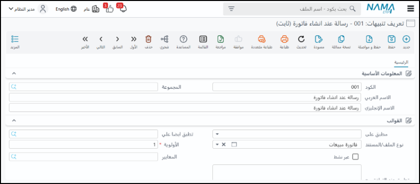 يمكن إرسال التنبيهات كإشعار داخل النظام، أو عبر البريد الإلكتروني، أو واتساب، أو الرسائل القصيرة. يمكن استخدامها لإرسال نماذج طباعة أو فواتير بصيغة PDF أو روابط للعملاء.