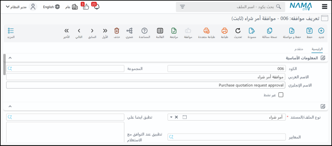 الغرض: يتيح النظام تحديد مستندات معينة تتطلب الحصول على موافقة من موظفين محددين قبل أن يصبح لها تأثير على قاعدة البيانات، فالمستند الذي ينتظر الموافقة يُعتبر كمسودة ولا يؤثر على البيانات حتى تتم الموافقة عليه.