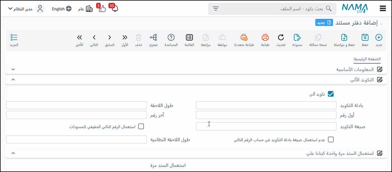 الدفاتر: تستخدم لتكويد المستندات كل دفتر له رقم خاص، ويجب أن يكون مرتبطاً بشركة، ويستخدم لنوع مستند محدد أو أنواع متعددة يمكن أن يكون التكويد يدوياً أو آلياً، مع خيارات لتحديد البادئة، طول اللاحقة، الرقم الأول، وصيغة التكويد (مثلاً بناءً على السنة المالية لإعادة ترقيم اللاحقة سنوياً).