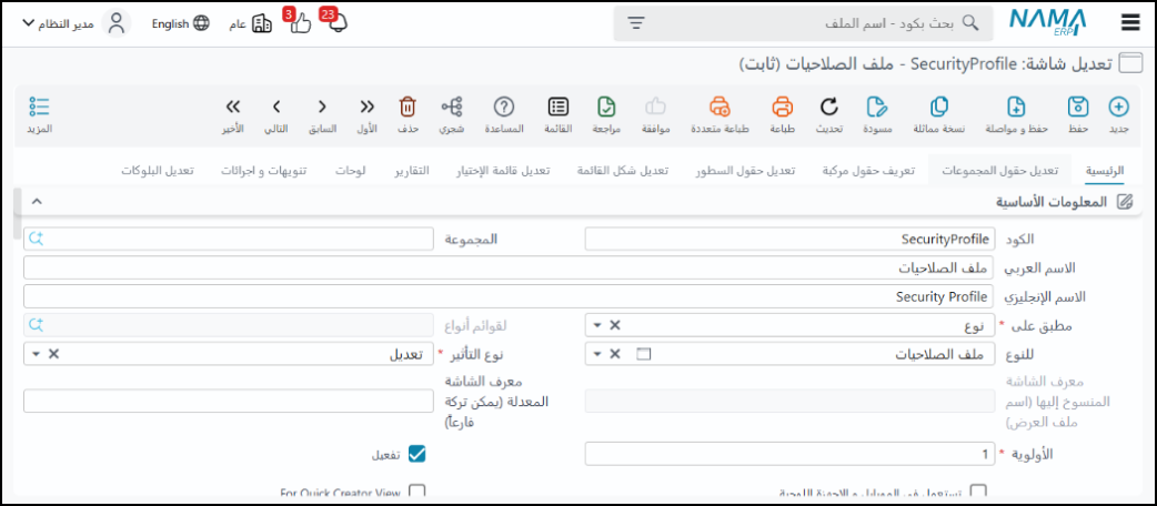 ◦ إمكانيات التعديل: يمكن إضافة صفحات جديدة، حذف صفحات، حذف أو إضافة حقول، حذف أو إضافة أزرار، كما يمكن إعادة ترتيب المجموعات (Groups) والحقول داخلها، تغيير عناوين الحقول والمجموعات، ويمكن التحكم في عرض الحقول في الجداول (Grids) وارتفاع الجداول نفسها.